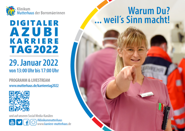 „Warum Du? ...weil's Sinn macht!“ Unter diesem Motto gibt das Trierer Klinikum Mutterhaus der Borromäerinnen am digitalen Infotag die Gelegenheit, einen umfassenden Einblick in die vielfältigen Berufs- und Karrieremöglichkeiten im Gesundheitswesen zu erhalten. Vertreterinnen und Vertreter verschiedener Berufsgruppen des Klinikums Mutterhaus stellen ihre Berufe und ihre Aufgaben vor. Außerdem beantworten sie persönlich Fragen, welche die digitalen Besucher live über die Streamingplattform stellen können.