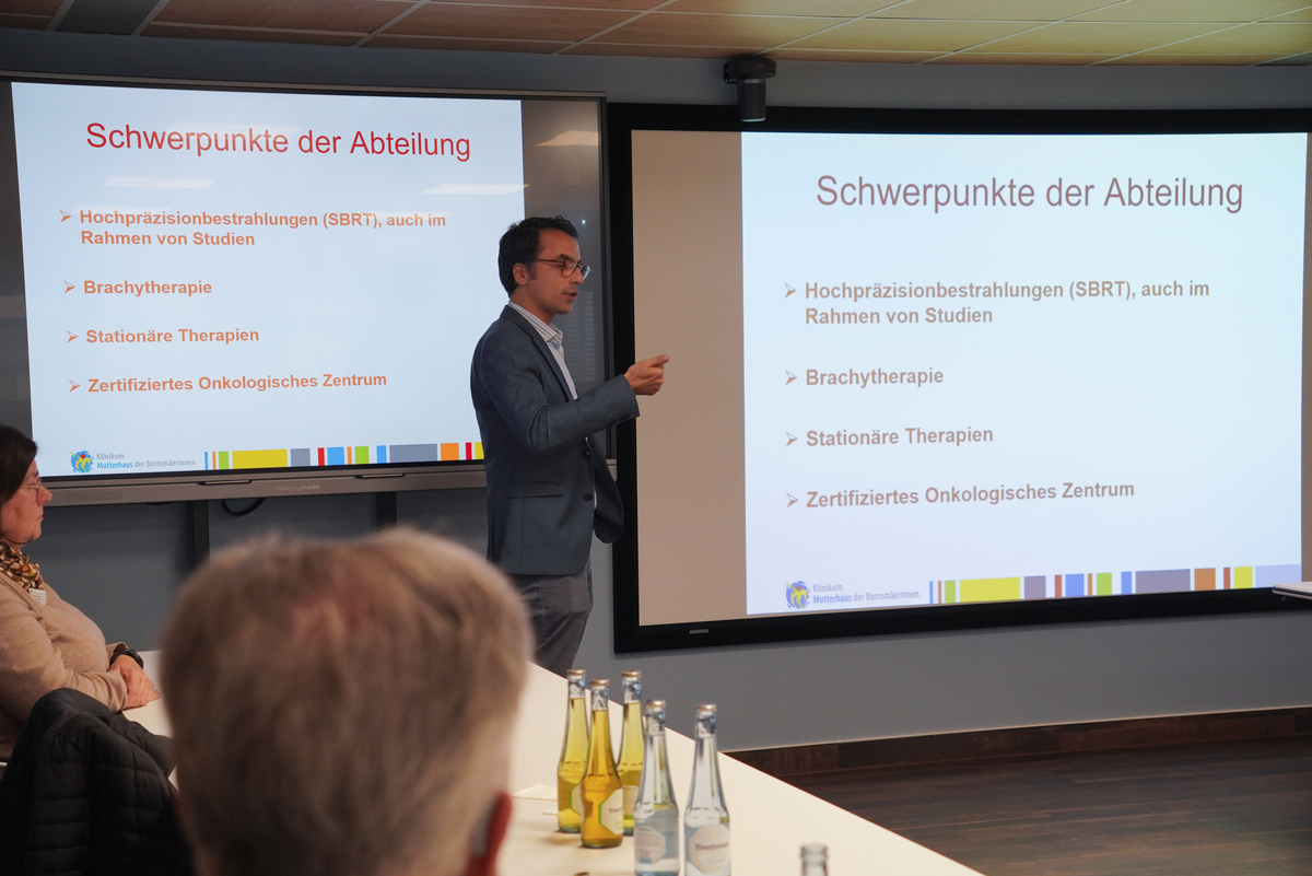 Der Abend wurde von Dr. med. Farid Mohammad, Chefarzt der Strahlentherapie/Radioonkologie, geleitet. Sein Vortrag beleuchtete die aktuellen Methoden und Technologien der Strahlentherapie, die im Klinikum Mutterhaus zum Einsatz kommen. Die Teilnehmenden erhielten einen umfassenden Überblick über die Behandlungsansätze und die Bedeutung der Radioonkologie.