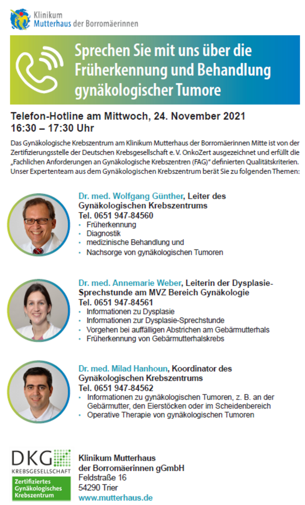 Dr. med. Wolfgang Günther, Leiter des Gynäkologischen Krebszentrums ist erreichbar unter Tel. 0651 947-84560. Er beantwortet Fragen zur Früherkennung und Diagnostik gynäkologischer Tumore. Auch für Fragen zu entsprechender medizinischer Behandlung und der Nachsorge steht er zur Verfügung.