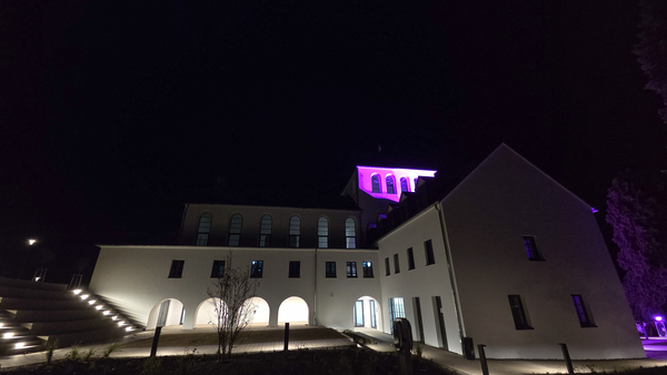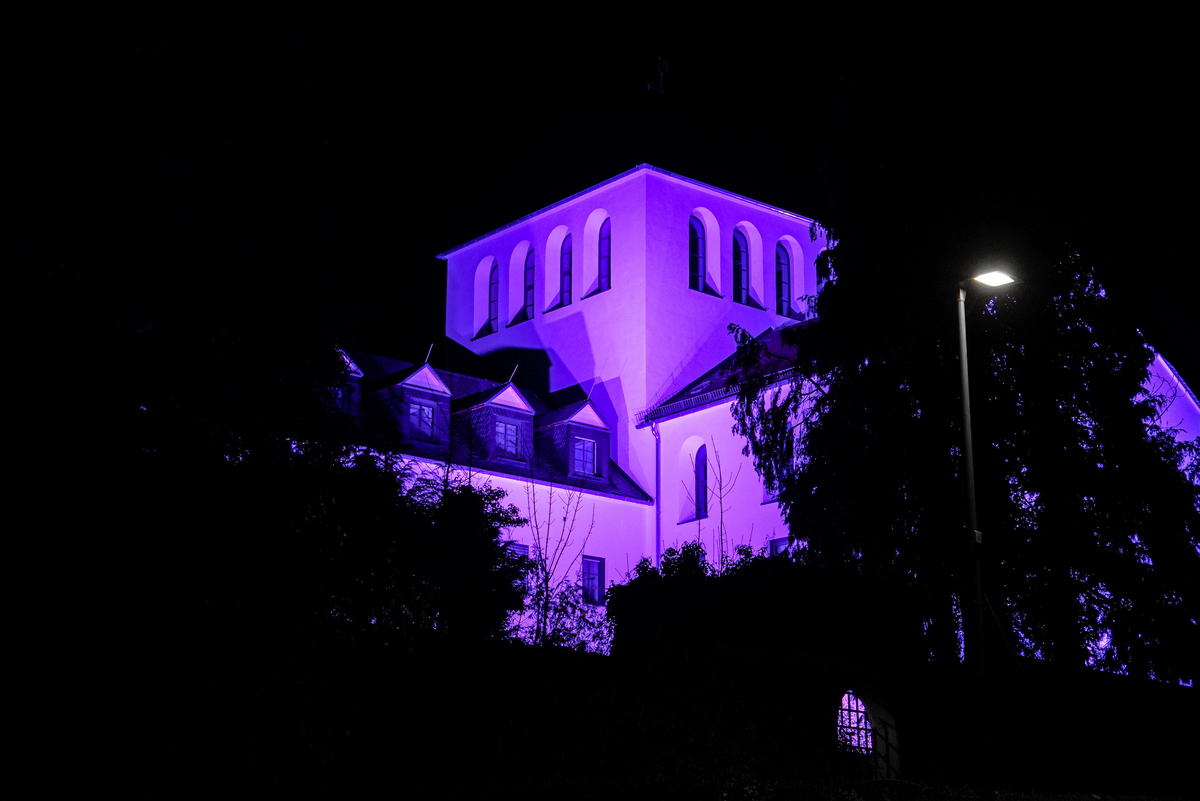 Anlässlich des internationalen Welt-Frühgeborenentags am 17. November machen das Klinikum Mutterhaus der Borromäerinnen und die Villa Kunterbunt e.V. auf den Start ins Leben der Allerkleinsten aufmerksam. Neben einer Ausstellung in der Bühne (dem ehemaligen Kunstkiosk) an der Südallee erstrahlte auch die Pflegeschule im ehemaligen Kloster St. Clara in leuchtendem Lila über der Stadt.