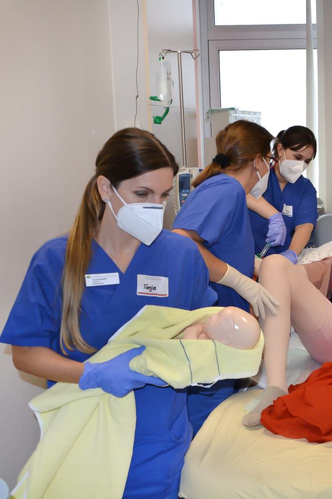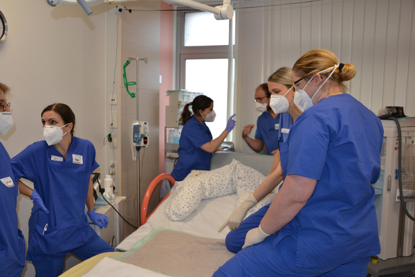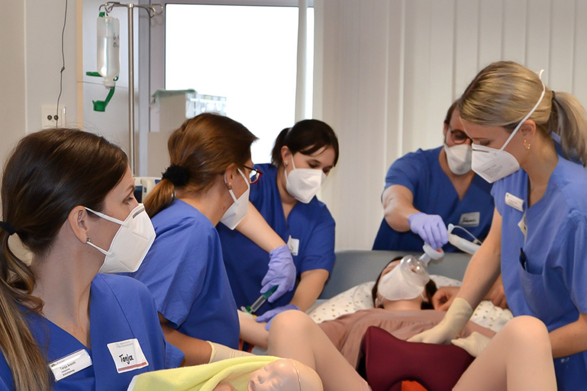 Im Rahmen einer zweitägigen Fortbildungsveranstaltung am 06. Und 07. Dezember 2021 zum Thema „Notfälle im Kreißsaal“ haben Mitarbeiter*innen aus Anästhesie und Geburtshilfe gemeinsam an einem interdisziplinären Simulationstraining teilgenommen. Ziel der Veranstaltung war es, die Zusammenarbeit beider Abteilungen im Bereich der Geburtshilfe in Notsituationen zu stärken und somit die Patientensicherheit zu erhöhen. Die häufigsten Szenarien geburtshilflicher Notfälle wurden simulativ nachgestellt und entsprechende Handlungsprozesse zwischen Anästhesist*innen, Gynäkolog*innen und Hebammen eingeübt. Im Anschluss erfolgte eine videogestützte Nachbesprechung der Trainingseinheiten.