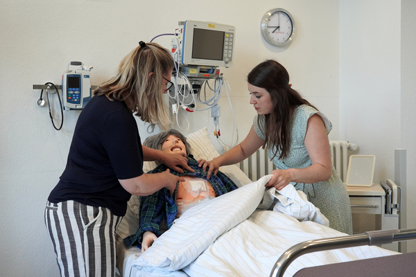 Das Lernen und Reflektieren der pflegerischen Maßnahmen in geschützter Atmosphäre bildet einen weiteren Lernort und eine wichtige Schnittstelle zwischen Theorie und Praxis, die die Eigenreflektion im späteren Berufsalltag und Behandlungsqualität am Patienten fördert. „Da Pflegesituationen komplexer und anspruchsvoller geworden sind, ist es uns wichtig, die Auszubildenden kontinuierlich und intensiv auf die praktischen Einsätze vorzubereiten. Mit den im Skills Lab bereitgestellten Tablets können auch Sequenzen gefilmt, Tutorials für andere Lernende erstellt und das pflegerische Handeln von Lehrenden und Lernenden gemeinsam reflektiert werden. Von den Auszubildenden wird das Skills Lab als sehr positiv und als gute Vorbereitung auf den Praxisalltag und Prüfungssituationen erlebt“, freuen sich Angelina Spurk und Monika Zehren, Lehrerinnen der Karl Borromäus Schule.