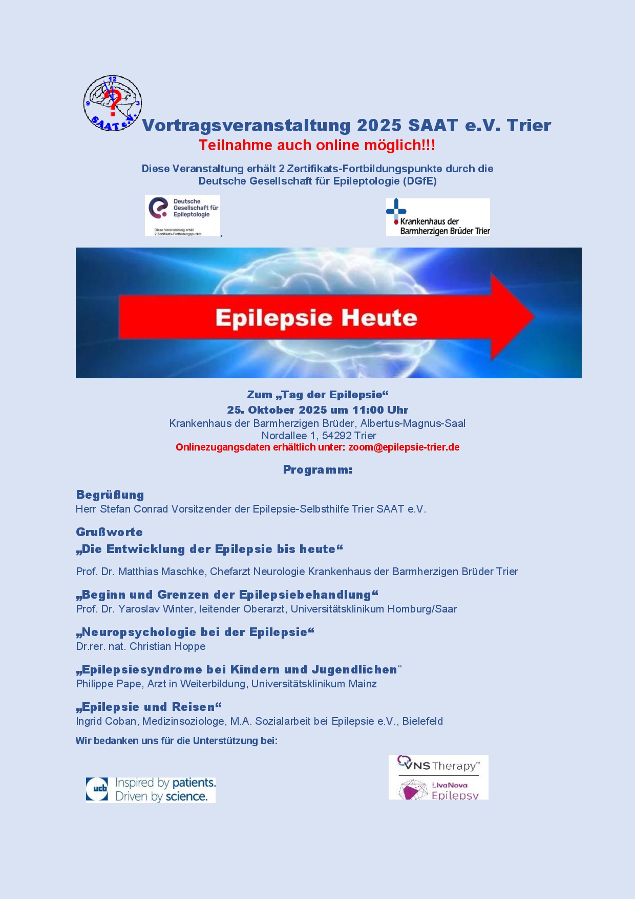 Teilnahme auch online möglich - Zugangsdaten erhältlich via zoom@epilepsie-trier.de