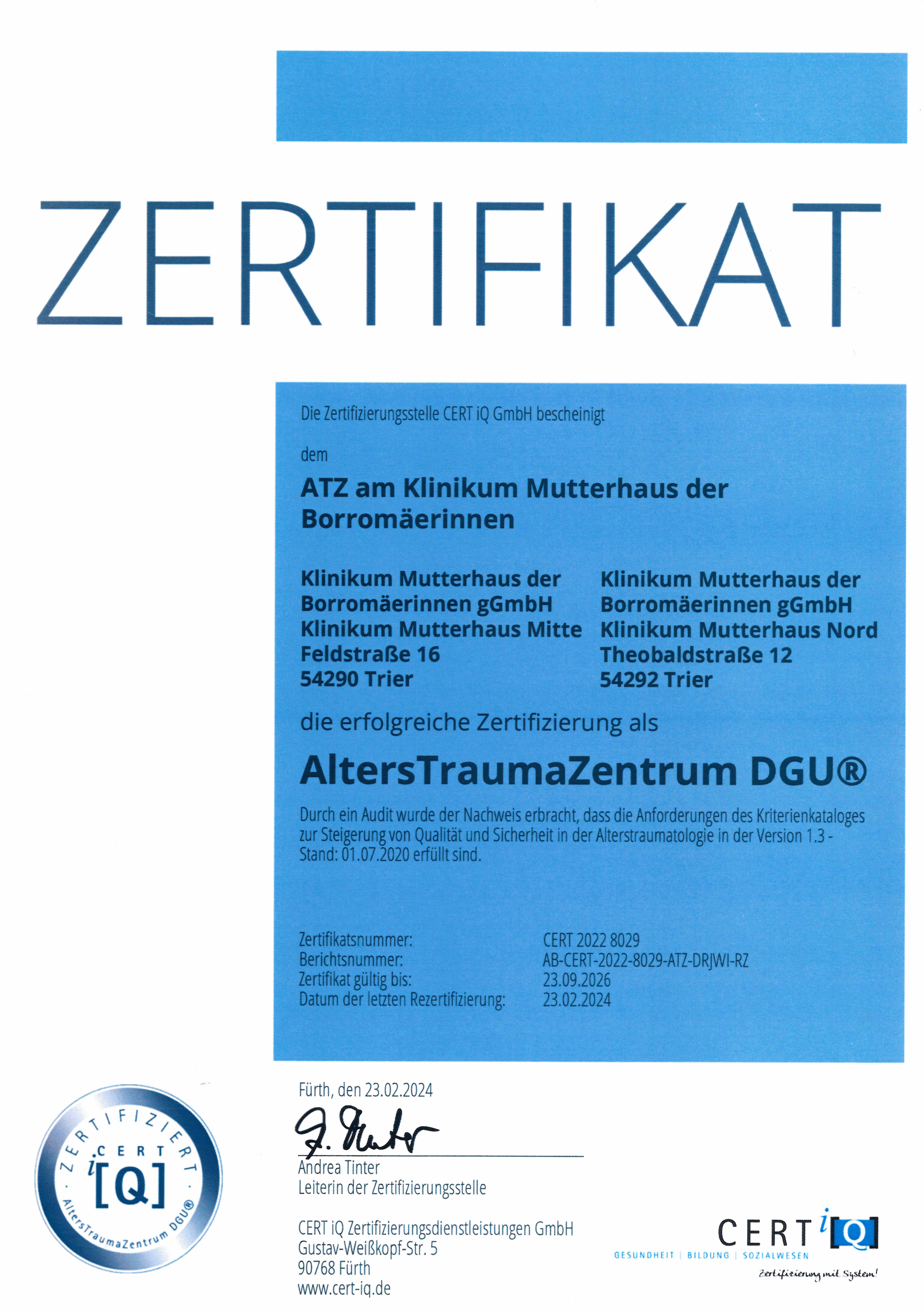 Am Klinikum Mutterhaus der Borromäerinnen verfügen wir zudem über ein nach den Anforderungen der Deutschen Gesellschaft für Unfallchirurgie e.V. (DGU) anerkanntes Regionales TraumaZentrum sowie ein AltersTraumaZentrum.