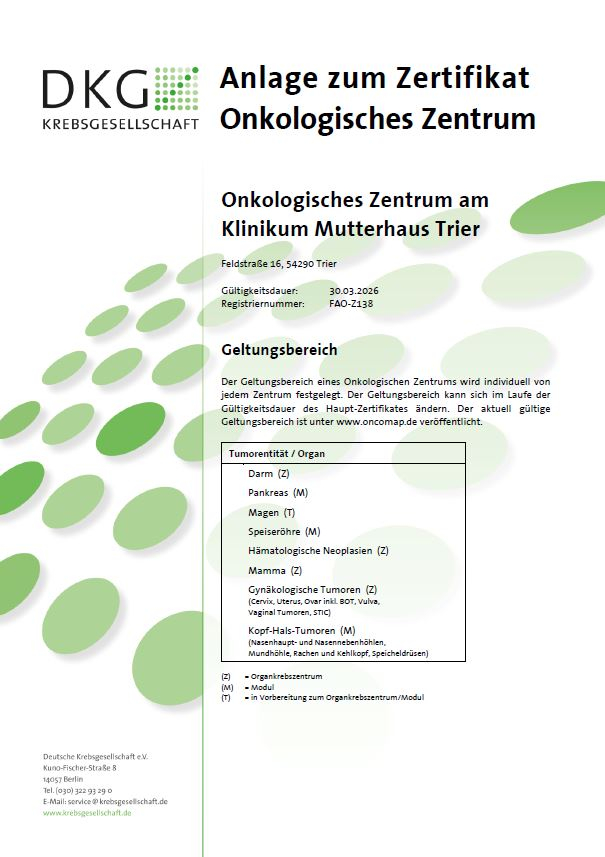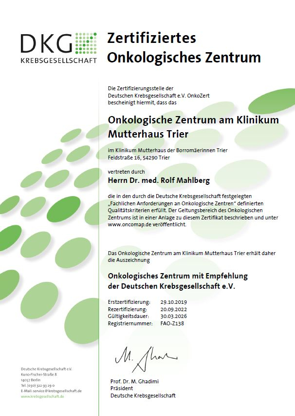 Das Onkologische Zentrum am Klinikum Mutterhaus der Borromäerinnen in Trier wurde erstmals in 2010 nach den Kriterien der Deutschen Gesellschaft für Hämatologie und Onkologie (DGHO) erstmal zertifiziert und zuletzt 2018 erfolgreich rezertifiziert.
