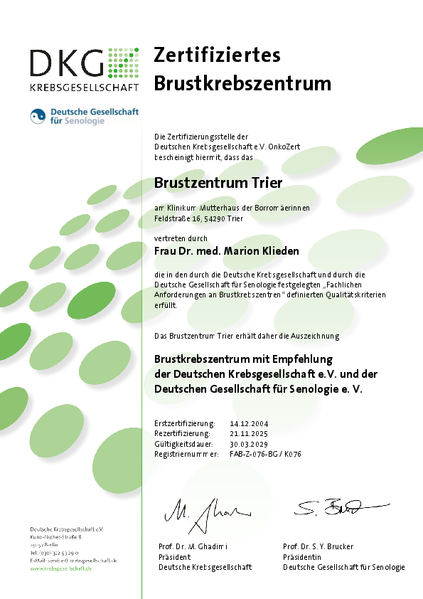 Schon seit 2004 erfüllt das Brustzentrum die Richtlinien der Deutschen Krebsgesellschaft (DKG) und der Deutschen Gesellschaft für Senologie (DGS). 2022 wurde das Brustzentrum erneut erfolgreich rezertifiziert.