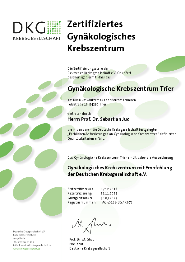 Das Gynäkologische Krebszentrum am Klinikum Mutterhaus der Borromäerinnen Mitte ist von der Zertifizierungsstelle der Deutschen Krebsgesellschaft e. V. OnkoZert ausgezeichnet worden.